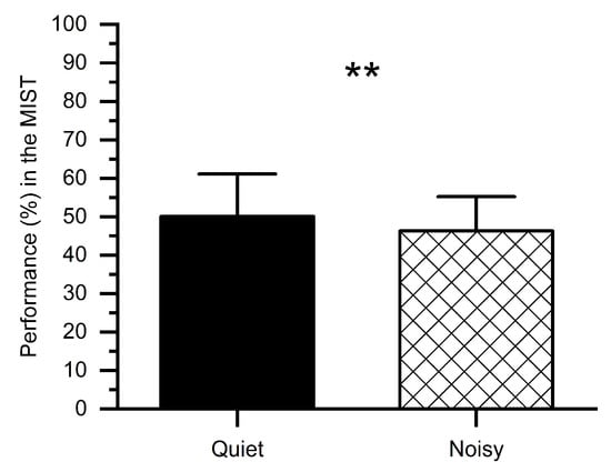 Percent performance in the MIST under stress conditions at quiet and noisy workplaces. Error bars indicate the standard deviations and stars (**) indicate significant differences ** p < 0.01.