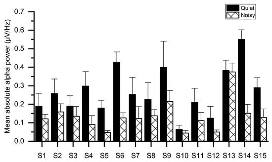 Average absolute alpha power for each subject while working at quiet and noisy workplaces.