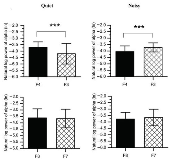 Average natural log alpha power recorded from the right frontal (F4 and F8) and left (F3 and F7) at quiet and noisy workplaces. Error bars indicate the standard deviation, and stars (***) signify significant differences *** p < 0.001.