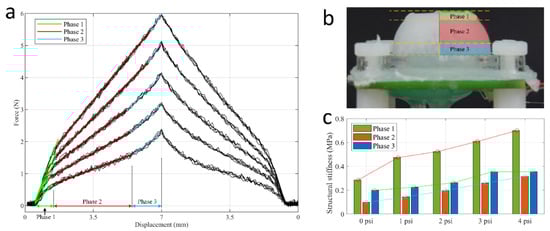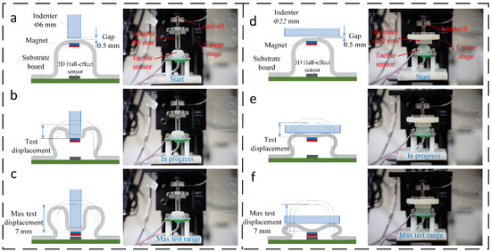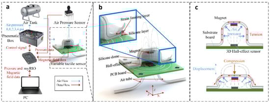 Figure 1a. A real-time controller (myRIO 1900, National Instruments, Austin, TX, USA) was used to implement real-time closed-loop control of the pressure and data acquisition of all experimental parameters, i.e., the air pressure from pressure transducer, contact force from the load cell, and magnetic field magnitudes from the Hall-effect sensor. A PC was utilized to control the linear stage and connected to the real-time controller as a host to synchronize the clock and log the real-time data of displacement of the indenter, contact force, magnetic field, and air pressure.