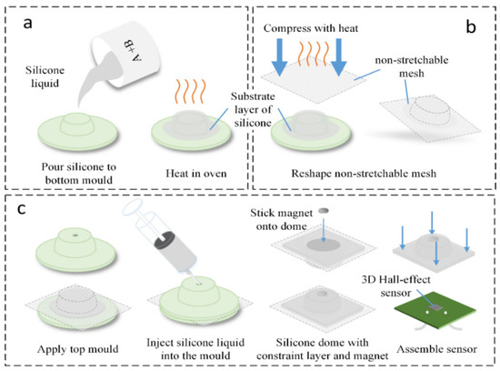 Figure 2c, silicone rubber precursors were mixed and degassed as in step 1, and then injected into the cavity between the molds. The dome was then cured for 5 h at room temperature (the oven was not used for this stage to allow air to escape from the silicone and reduce defects in the dome). After curing was complete, the dome was removed from the molds and a permanent magnet was glued with Sil-Poxy (Smooth-On, Inc.) onto the internal surface of the dome. The resulting elastomeric dome was affixed onto a PCB with a 3D Hall-effect sensor (MLX90393, Melexis, Ieper, Belgium) to form a fluidic void.