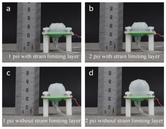 Figure 3 between the sensor’s dome with and without a strain-limiting layer. Both samples were fabricated with Ecoflex 0050 as the elastomeric layer and using the same mold. In comparison, the dome with strain-limiting layers has negligible deformation when both samples were under the same internal pressure, exhibiting good characteristics for use as a sensor.