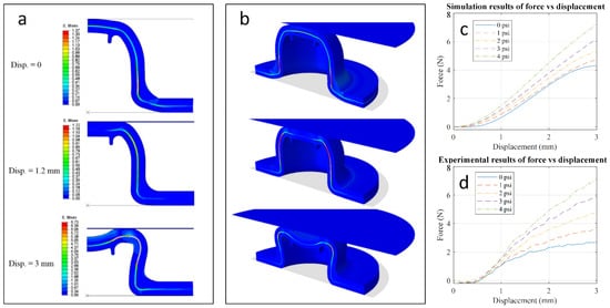 A Finite Element (FE) model of the sensor’s inflatable dome was developed using commercial FE software (ABAQUS standard solver, Simulia, Providence, RI, USA) to characterize the representative reaction force on the sensor during indentation as well as observing the deformation mechanisms within the structure, which is not possible to capture in an experimental setting. The strain and stress distribution contours within the sensor obtained from the simulations can then be used as a design tool for modification of the sensor to suit different applications.