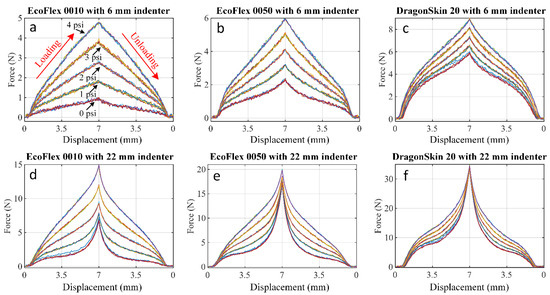 Figure 4, before each test, the indenter was raised to leave a 0.5 mm gap between the indenting surface and the top surface of the elastically inflatable dome. This ensured a zero-valued contacting force in the beginning of this stage and avoided adhesion between the indenter and dome. During the test, the indenter was lowered slowly until contact was made with the silicone dome and then moved downward at a constant speed. An indenter of 6 mm diameter was implemented to calibrate the situation when the contacting area is small, while an indenter of 22 mm diameter was applied to calibrate the situation when contacting area is larger than the fluidic dome.