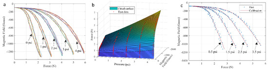 The soft sensor was calibrated to correlate the change in the magnetic field output signal with the applied force across a range of pressures within the elastomeric dome. Each elastomeric dome (three different durometers) was calibrated for five different air pressure conditions, from 0 to 4 psi in 1 psi increments (five repeats at each condition). For each pressure condition, the sensor was cyclically indented vertically between 0 and 7 mm in 0.1 mm increments at a constant speed of 2 mm/s. The measurement of contact force and air pressure are both taken at the end of 0.1 mm increments. The applied external force was recorded by the load cell while displacement was recorded by the linear stage connected to the PC. The data sampling rate is 200 Hz. The air pressure was recorded by the pressure sensor and the magnetic field is recorded by the Hall-effect sensor.