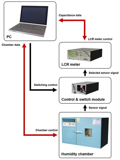 The measurement system was fully automated and capable of multiple measurements up to 32 samples. The fabricated humidity sensors were wire-bonded to printed circuit boards (PCBs), and the PCBs were connected to a control and switch module (SCXI series, National Instruments, Austin, TX, USA). The signal from a selected sensor by the switch was transferred to a precision LCR meter (4284A, Hewlett-Packard, Palo Alto, CA, USA). To control relative humidity, the PCBs were placed in a humidity generating chamber (model 2500, Thunder scientific corporation, Albuquerque, NM, USA), and the variation of the capacitance of the humidity sensors was measured by using the LCR meter. When measuring the capacitance at each humidity level, to minimize the effect of possible fluctuations of the humidity chamber, ten data points were collected, and the average value was taken. In addition, because capacitance can arise from not only the sensors but also the PCBs, measurement cables, and air, one PCB on which the humidity sensor was not mounted was measured in the chamber to clarify the parasitic element. After that, the parasitic capacitance was subtracted from the measurement results of the actual humidity sensors. Every measurement was repeated at least ten times for a single device to check the reproducibility, and ten devices randomly picked from the same wafer were also verified to eliminate any possibility of errors from fabrication non-uniformity. The schematic of the measurement system is shown in Figure 2.