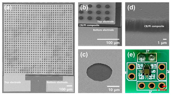 SEM images of the (a) fabricated humidity sensor, (b) top electrode/sensing dielectric layer/bottom electrode stack, (c) hole pattern in the top electrode, and (d) carbon black/polyimide composite after photolithography patterning. The humidity sensor mounted on a PCB is shown in (e).