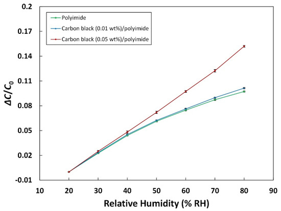where represents the initial capacitance of the sensor measured at 20% RH humidity level. Figure 4 shows the sensitivity of the humidity sensors with the different amounts of carbon black as a function of relative humidity. The error bars stand for the standard deviation calculated from ten times repetition. It can be confirmed that all three different sensors exhibit good linearity. The linearity is represented by the determination coefficient R2 from the sensor output and the regression linear curve. The calculated coefficients of the sensors with 0, 0.01, and 0.05 wt% of carbon black are 0.979, 0.982, and 0.999, respectively. The sensor with 0.01 wt% of carbon black has a slightly higher sensitivity of 10.13% (20–80% RH, 0.1688%/% RH) than that of the sensor made of pure polyimide, which is 9.73% (0.1622%/% RH). The amount of 0.01 wt% of carbon black seems not enough to significantly change the dielectric property of the composite, which results in little difference in the sensitivity. On the other hand, the sensor with 0.05 wt% of carbon black shows a sensitivity of 15.21% (0.2535%/% RH), which is much higher than that of the sensor with pure polyimide. It is known that moisture in the polymer composite can be stored at the interfacial space between the additives and the polymer [34]. The increase in the sensitivity of the humidity sensor could also be explained by the space at the interface between the carbon black additive and the polyimide matrix that serves as a site for moisture storage. Because of the large surface area of the carbon black nanoparticles, the area of the interface is also large, resulting in the increase in the water contact area, adsorption, and uptake. However, it was confirmed that the addition of carbon black more than 0.05 wt% (not shown here) rather deteriorated the performance of the humidity sensor. This phenomenon can be explained by obstructing the diffusion of water into the composite by excessive amounts of the carbon black additive. The major mechanism of humidity sensors using polymer materials is usually based on water diffusion into the polymer matrix. Kwon et al. tried to add large amounts of carbon black into the polyimide to enhance the mechanical properties as a passivation film. They proved that the addition of large amounts of carbon black can decrease the water diffusivity into polyimide by using a dynamic vapor sorption intrinsic analyzer. [35]. Based on all these results, it can be concluded that the amount of the carbon black additive has a great effect on the property of the capacitive humidity sensor, and the optimal proportion should be figured out. Furthermore, when considering the change in the conductance of the composite that can lead to a breakdown of the capacitor, the precise control of the amount of carbon black is extremely important. In our case, because of the little amount of the additive, a very high resistance (out of range) was observed for every sensor, indicating no breakdown of the dielectric.