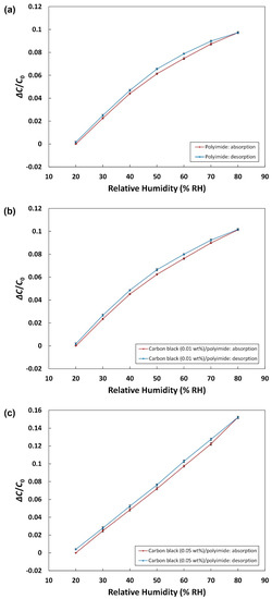 where is the maximum difference in output during the absorption and desorption, and denotes the full-scale output. Figure 5a–c show the hysteresis characteristics of the humidity sensors with 0, 0.01, and 0.05 wt% of carbon black, respectively. In Figure 5a–c, the maximum absolute values of the hysteresis error are calculated to be 2.17, 2.02, and 1.80%. Although all three different sensors present quite low values, the addition of carbon black in the polyimide made the hysteresis characteristic better. The hysteresis of humidity sensors based on polymers is thought to be due to the formation of clusters of sorbed water molecules [36]. In the carbon black/polyimide composite, the carbon black particles with a large surface area give rise to an increase in the contact area with water molecules, which can make water molecules more dispersed without forming clusters and easier to be desorbed. This seems to be the reason for the improved hysteresis of the humidity sensor with the carbon black/polyimide composite.