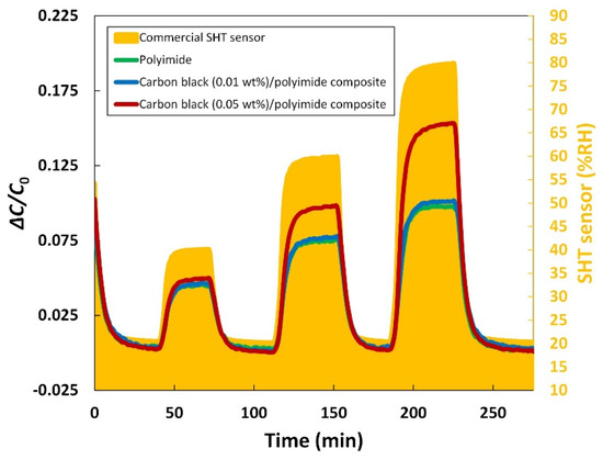 To study the dynamic response of the humidity sensor, the humidity level in the chamber was ramped up and down between 20% RH and three different higher levels, which are 40, 60, and 80% RH, respectively. Figure 6 shows the dynamic response of the humidity sensors. It can be observed that all three humidity sensors respond properly to the change in the humidity. In terms of the response speed, however, the addition of carbon black made a difference. When the humidity was changed between 20% RH and 80% RH, the response time, which was defined as a time required to reach 90% of the entire output change, of the humidity sensor with 0.01 wt% of carbon black was not significantly improved compared to that of the sensor with pure polyimide. On the other hand, the sensor with 0.05 wt% of carbon black had a response speed ~10% faster than that of the others. This result can also be explained by the role of carbon black in increasing the contact area and desorption speed as mentioned above. For comparison, a widely used commercial humidity sensor (SHT3x, Sensirion) was measured under the same condition. As can be seen in Figure 6, all of the developed humidity sensors have a relatively slower response than the commercial sensor. The humidity sensor with 0.05 wt% of carbon black showed ~1.3 times slower response during the humidity variation between 20% RH and 80% RH. Nevertheless, this performance is still comparable and considered as acceptable for use in humidity measurement, taking into account the excellent performance of the commercial sensor that has been already optimized.