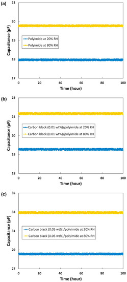 To evaluate the long-term stability of the humidity sensor, the capacitance was measured and recorded for 100 h at two different ambient conditions: low humidity level (20% RH) and high humidity level (80% RH). Figure 7a–c show the long-term stability characteristics of the humidity sensors with 0, 0.01, and 0.05 wt% of carbon black, respectively. Because even the humidity sensor made of pure polyimide was very stable, a remarkable effect of the carbon black additive on the long-term stability was not observed. However, as shown in Figure 7, it can be confirmed that the capacitances of all the sensors are maintained very stably with a variation less than ±0.37%. This variation is thought to be mainly due to fluctuations of the humidity generating chamber. Even though the chamber is set at a certain level of humidity, there are always fluctuations, and they affect the output of the sensors. In addition, small temperature fluctuations in the chamber also exist. Because of this problem, our measurement set-up could cause a measurement error of around 1% RH for the three sensors. However, this limit may be improved by the calibration of the equipment or obtaining more data points for averaging.