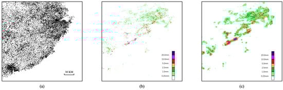 (a) Distribution map of automatic weather stations; automatic weather station rainfall data of 9:00 a.m.–9:30 a.m. on 23 May 2017; (b) and data after interpolation (c).