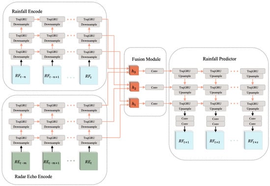 RN-Net consists of four parts: Radar Echo Encoder, Rainfall Encoder, Fusion module, and Rainfall Predictor. The Radar Echo Encoder and the Rainfall Encoder encode spatiotemporal features of radar echo data and recent rainfall data , respectively. Then, the fusion module combines the radar echo feature and rainfall feature so as to provide more spatiotemporal feature support for nowcasting. Finally, the rainfall predictor receives the fused feature and makes forecasts .