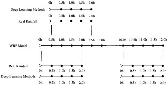 In addition, to compare with the traditional method, the WRF model is run to get the rainfall nowcasting. Its spatial scope is the same as the dataset, and its time scope covers the testing set of the dataset. The WRF model is integrated every 6 h and forecasts the next 12 h with a time resolution of 0.5 h of rainfall. Our deep learning methods forecast the rainfall for the next 2 h every 0.5 h. In order to compare the two types of rainfall nowcasting methods, we designed a special comparison method, as shown in Figure 3. First, we extract 2 h of data every 0.5 h from the 12 h WRF model rainfall forecast, and a total of 21 sets of data. Then, we compare each set of data with the corresponding real rainfall. However, the WRF model has a spin-up period whose duration cannot be determined, and the forecast in this period is usually not used. In order to avoid the spin-up period, the best evaluation results among the 21 sets of data are used as the WRF model evaluation result within 12-h. Meanwhile, we also compared our deep learning methods rainfall forecast of these 21 time periods with the corresponding real rainfall. The average of the 21 evaluation results is used as our deep learning methods evaluation result within 12-h. We compare all the 12-h WRF model forecasts integrated every 6 h in the testing set with the deep learning methods forecasts through the above method. This comparison method not only solves the problem of the different forecasting frequencies of the two methods, but also avoids the spin-up period of the WRF model.