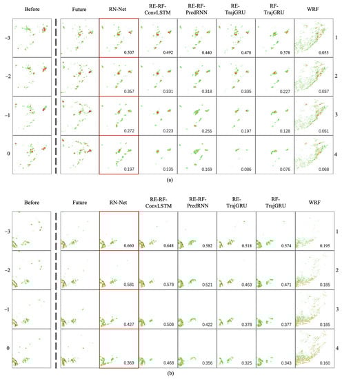 Figure 4 visualizes two representative cases for RN-Net, RE-RF-ConvLSTM, RE-RF-PredRNN, RE-TrajGRU, RF-TrajGRU, and WRF model. From this figure, we observe that all of the deep learning methods except RF-TrajGRU can make accurate forecasting in the first hour, which is consistent with the performance of evaluation metrics. The rainfall data which is input data of RF-TrajGRU are not enough to provide enough meteorological spatiotemporal features to support rainfall nowcasting. Even in the first half-hour, there are some deviations. Moreover, the forecast results of the deep learning methods will gradually disappear after one hour. Among the three dual-input methods, the disappearance problem of the method including ConvLSTM is the most serious. This is due to the structure of RNN [] and the distance loss function []. However, there is no identical situation with the WRF model. WRF model forecast results often have large-scale false alarms, which is identical to the performance in evaluation metrics.