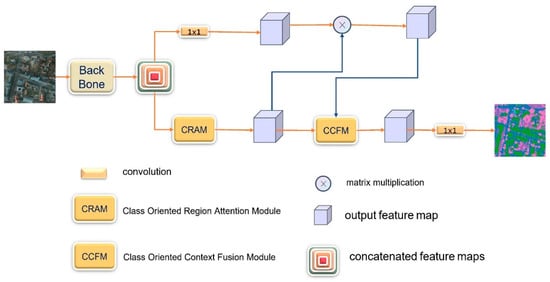 Figure 2 shows our end-to-end network model for remote sensing semantic segmentation. The backbone network is HRNET, which uses CRAM to explore the relationship between the output classes of semantic segmentation and the patch regions and the recurrent CCFMs to explore the relationship between the output classes and the specific pixels in the image. CRAM is applied to resolve the mismatch problems in the process of semantic segmentation of high-resolution aerial images. The model can collect information from different branches and has a global understanding of the scene using CCFM.