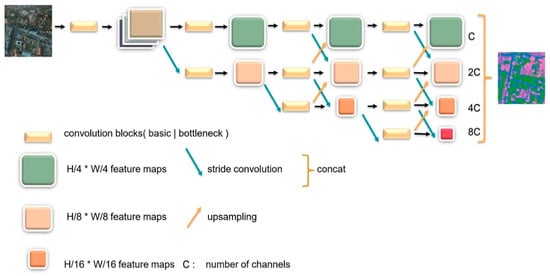 Many researchers have widely utilized convolution operations in series to compute low-resolution representations and then gradually recover high-resolution representations. Typical networks designed following this rule are U-Net, SegNet [], etc. A drawback of these networks is the loss in the position sensitivity of the representation, and the decoder part can hardly recover all the information. In order to learn the high-representation and reduce the loss in spatial accuracy, HRNet [] adopts the policy of maintaining the high resolution during the whole feature extraction procedure. The architecture is composed of several modules which are multi-resolution convolution modules in parallel, the interactive fusion module, and the representation head module. Figure 3 below depicts the whole body of HRNet.