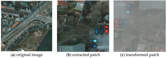 (a) is the original image with 6000 × 6000 pixels. (b) is the extracted patch with 512 × 512 pixels from the original input image and (c) is the transformed one with flip, brightness, and contrast change operations, etc.