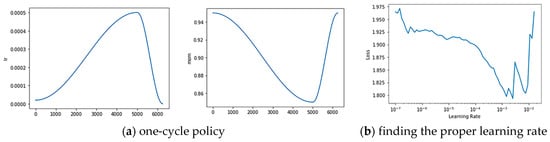 We trained the model on two Nvidia Titan XP GPUs (12 GB memory and 64 GB RAM) with mixed precision, synchronous batch-normalization, and data parallel distribution tricks. All the proposed method and models were implemented using pytorch and fastai []. Due to the limitation of the memory size and high-resolution image, we cropped the input data with a small sliding window with 512 × 512 pixels before the model training process. During the stage of model inference, we made a prediction on an image with 512 × 512 pixels and rebuilt the 6000 × 6000 image using the extracted patches for the evaluation. The models use the initializing weight pretrained on the ImageNet dataset. We adopted the one-cycle policy put forward by Leslie N. Smith [] in order to find the appropriate learning rate. As the curve and policy suggested, we set the initializing learning rate, weight decay, and momentum parameter to 0.004, 2 × 10−4, and 0.9, respectively, with batch size five per GPU. Cross-entropy loss was employed to analyze the difference between the ground truth and inference results. Models were trained for 200 epochs for convergence. To verify the robustness of our model and to compare it with other state-of-the-art methods, we added k-fold cross-validation based on the Vaihingen dataset. Considering the size of the dataset and the accuracy and efficiency of the model training, we set the k-parameter as the commonly used number 10 in the machine learning domain. Specifically, we partitioned the 16 images with annotation information in Vaihingen into ten consecutive copies, each of which was treated as a test set once, and the rest was taken as the training set of the model. Finally, we calculated the final recognition overall accuracy by obtaining the average of the ten results. Figure 10 shows the details of several tricks used during training.