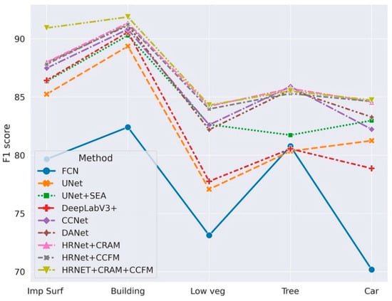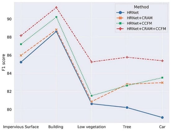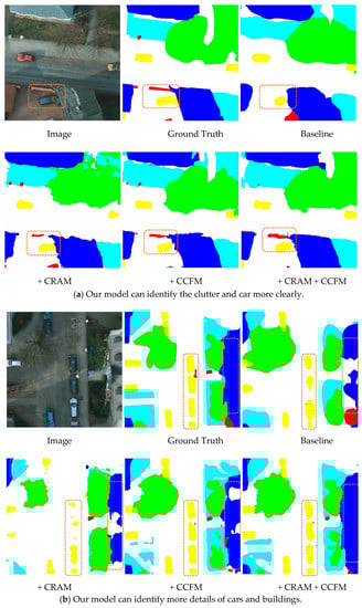 To quantitatively verify the validity of our model, we performed ablation tests on the Potsdam validation set. In the experiment, we used the HRNetV2-W48 model pretrained on ImageNet as the backbone [] and added each sub-module to verify functionality individually. When using HRNet + CRAM, we directly took the output feature map of CRAM and the output value of the 1 × 1 convolutional layer as the final output; when using the HRNet + CCFM alone, we substituted part of CRAM with a 3 × 3 convolutional layer, and the number of channels remained identical. As CRAM can enhance the connection between different sub-regions and the final output category, and CCFM enables the model to concentrate more on the specific pixels in the image as well as the global information in the final output, after incorporating CRAM and CCFM, it was evident that the F1 score of each output category improved (*: Imp Surf means the impervious surface, Low veg means low vegetation). The significant performance improvement was the car recognition in the original image. As the target car was tiny, detailed semantic information is prone to be lost in the process of semantic segmentation. The addition of CRAM provided an excellent way of capturing information on objects of various sizes, while using CCFM to extract global information in a long range context, thus boosting the F1 score for car identification from 79.11% to 85.38%. Table 1 shows ablation study result in the Potsdam Dataset of different modules. Figure 12 visualizes the ablation study result.