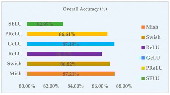 We also performed the ablation study on the activation functions. The selected comparison objects were mainly the following activation functions: Mish, Swish, SELU, ReLU, PReLU, GeLU. To make the results more reliable, we only replaced the activation function in the network with Mish, and the other hyperparameters were kept constant; the results of the experiment on the Potsdam dataset are shown in the following table. It can be concluded that the robustness of the Mish activation function was better, which can improve the model performance for semantic segmentation in remote sensing images. Table 2 shows ablation study result of different activation functions. Figure 13 visualizes the ablation study result.