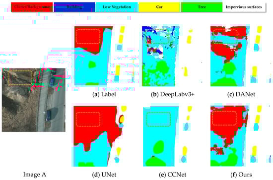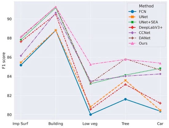 We present a quantitative analysis in the following Table 3. From Table 3, it can be noticed that several models considering attention mechanisms (UNet + SEA, CCNet, DANet in Table 3) exhibited greater superiority in the recognition of small target objects (cars, etc.) in remote sensing images, where the UNet + SEA model had a 4.37% improvement in the F1-score compared to UNet alone for semantic segmentation. The performance of CCNet and DANet was comparable, while our model improved the final average F1-score and OA over the other approaches by taking into account the effects of the relationship between output categories and segmented local patches as well as the global semantic information. Although our model had a great margin in the segmentation of cars, it had minor advantages compared with the others in the recognition of buildings. This may be attributed to the covered trees on the roof which lowered the performance. Table 3 shows comparison study result of different state-of-the-art methods. Figure 15 visualizes the comparison study result.