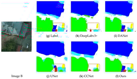 In order to verify the validity and precision of our method, we selected several state-of-the-art methods in the field of semantic segmentation and evaluated the pros and cons of different methods by conducting experiments, specifically adopting the following approaches: FCN, UNet [], UNet [] + SEA [], DeepLabV3+ [], CCNet [], and DANet [] and qualitatively show the performance of the model in Figure 14. From Figure 14, it can be concluded that DANet, CCNet, and our methods are significantly better than the other methods chosen because all three employ an attention mechanism that allows the model to better incorporate local detail features in the image with global semantic information. From Figure 14c,e,f below, we can observe that the part of the box region in orange looks like a low bush, and both DANET and CCNET misidentified this area, while our method correctly identified it. From Figure 14h,j,l, it can be noted that CCFM’s attention to the relationship between the output category and the global pixels enabled our model to have a greater advantage in recognizing the detailed outer contours of objects, while the DeepLabV3+ and UNet models in Figure 14 could not preserve the spatial location information well in the input image and failed to restore all the information of the original in the upsampling process. Neither had a good recognition of the objects in the frame.