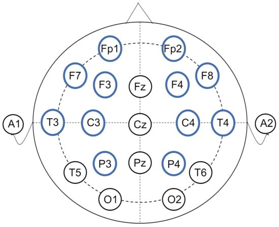 The layouts of EEG electrodes. The electrodes used in this study are labeled in blue circles.