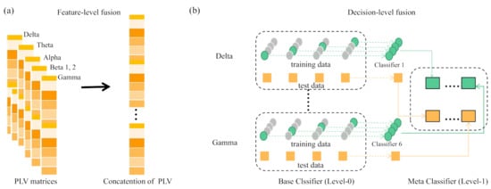 Schematic diagram of fusion strategy. (a) indicates the feature-level fusion and (b) is the decision-level fusion using stacking.