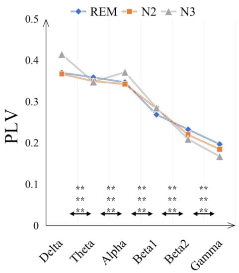 Comparisons of the average PLV values between six frequency bands for three sleep stages. The double-asterisk ‘**’ indicates that there is a significant difference of p < 0.001 by ANOVA test.