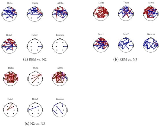The brain network difference topoplot between REM and N2 (shown in (a)), REM and N3 (shown in (b)) and N2 and N3 (shown in (c)) for different frequency bands. The red line represents the increase area, and the blue line indicates the decrease area.