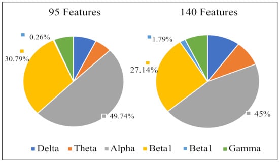 Percentage (%) of PLV features from different frequency bands in the features with first 95 and 140 sorted values.