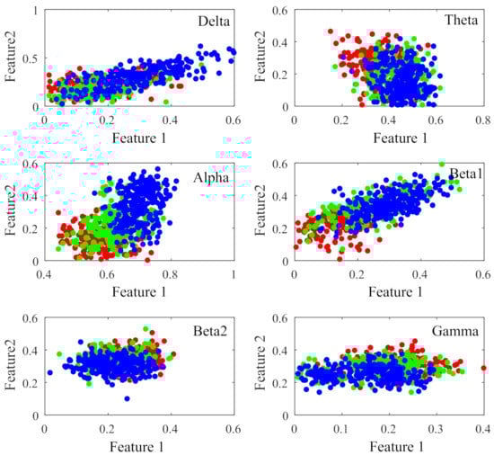 2-D figure of PLV feature visualization for each frequency band. The Feature 1 and Feature 2 are the selected features with the first two largest values, respectively. The dots represent different sleep stages (red:REM, green:N2, blue:N3).
