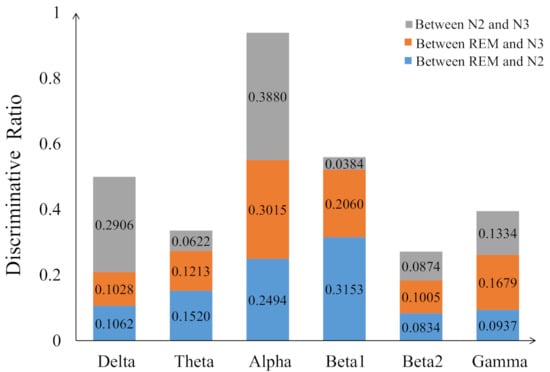 where and represent all samples of class 1 and class 2, respectively. The and indicate the number of two class samples [41]. The is ranging from 0 to 1 and its bigger value means more discriminate between the two classes. We calculated the bi-serial correlation coefficient between every two sleep stages (REM and N2, REM and N3, and N2 and N3) for PLV feature matrices. In total, we sorted the 3 × 66 × 6 (sleep stages × PLV × frequency bands) values to evaluate the features across different frequency bands. We also defined the discriminative ratio as setting a threshold t to represent the number of features, calculating the sum of the first sorted t between every two sleep stages and then obtaining the ratio of each frequency band. In our case, t is set to 36.