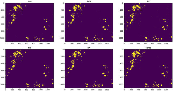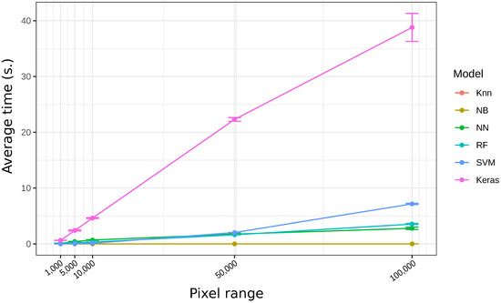Concerning the time spent by each classifier to be trained, it is worth mentioning the outstanding difference between Keras and the remaining algorithms. Furthermore, for each classifier, the time increase was more significant from 50,000 pixels onwards; except with KNN and NB, whose times were barely affected. Thus, between 10,000 and 50,000 pixels, a compromise can be achieved between time spent in training and robustness in the random sampling of pixels.