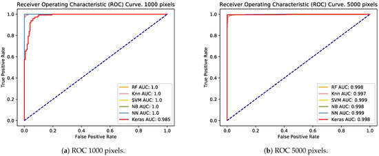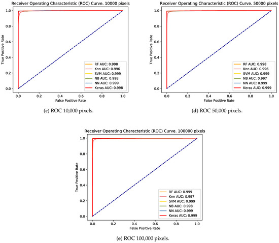 The trained classifiers were tested with a test data set, comprised of 30% of the sample corresponding to each set of pixels. Overall, the performance achieved by the classifiers with different sets of pixels was close to 1. Thus, the analysis of the area under the curve (AUC) obtained from the different ROC curves was also close to 1 (Figure 2a–e). Only Keras with 0.98 had an AUC below 0.99 for the 1000-pixel proposed model (Table 1, Figure 2a).