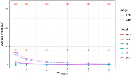 The time taken to classify one image differed widely, depending on the classifier and the image size (from 1.5 to 6.1 MB; Table 2 and Figure 3). Regardless of the image size, KNN and NB were the fastest algorithms, being slightly affected by both the number of threads and the image size. On the other hand, SVM and RF were the slowest algorithms, which were strongly affected by the size of the image and the number of processing threads. As Keras handles the number of threads independently, due to its implementation, it always involves all threads of the processor. Thus, the average classification time with this algorithm was always the same (Figure 3).