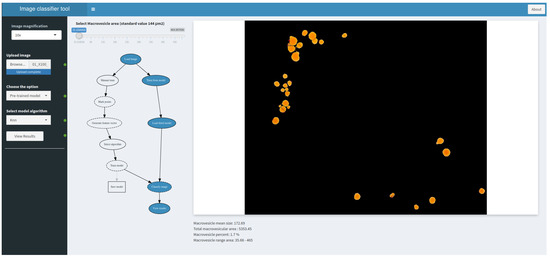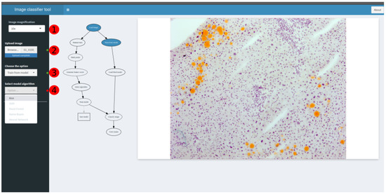 The user sets the number of microscope magnifications when capturing the image (Figure 6(1)). This determines the size of each pixel (in microns). Then, after loading the image (Figure 6(2)), the application allows the user to select a pre-trained model from several algorithms, or to manually train the model by marking the points of interest on the image (Figure 6(3),(4)). Afterwards, the application classifies the image and returns the number and extension of fat vacuoles over the total image, as well as the macrovesicle percentage (Figure 7).
