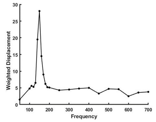 Figure 1 shows a plot of weighted displacement versus frequency for decellularized human dermis composed primarily of type I collagen [8]. The resonant frequency is defined as the frequency at which the maximum displacement occurs. The resonant frequency of decellularized dermis ranges from about 100 to 150 Hz, depending on the sample thickness, and the modulus at 5% strain is about 2 MPa [8,9].