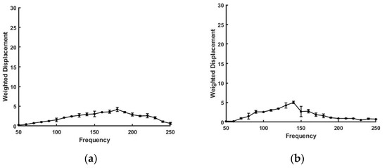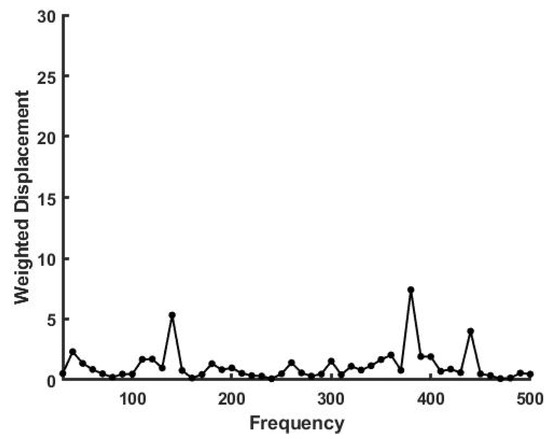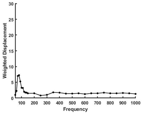 Weighted displacement in μm vs frequency in Hz for skin in vivo over the biceps muscle. Skin is a composite material containing cells, collagen fibers, blood vessels and subcutaneous components including muscle.