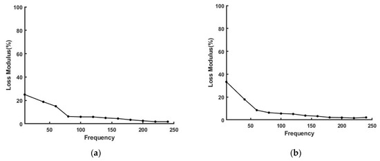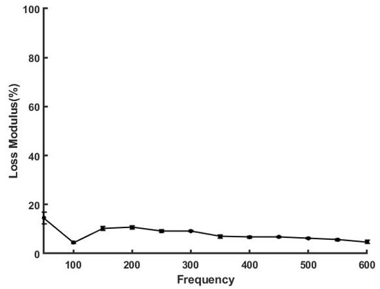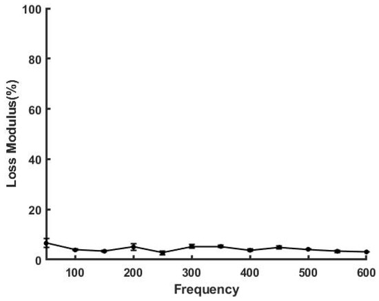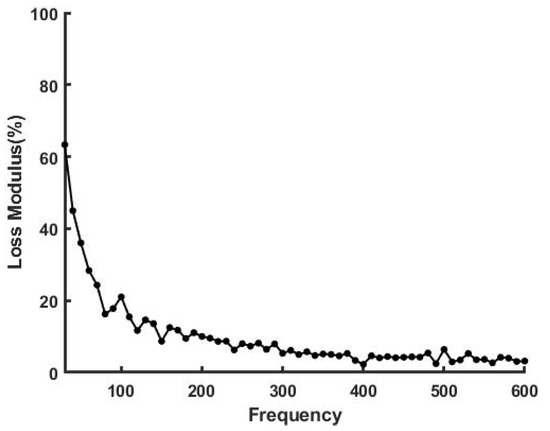 Viscous loss measurements, which are related to the energy dissipation of a material, are reported as a percent of the elastic modulus. Samples are subjected to three pulses of audible sound waves at frequencies between 50 and 500 Hz in steps of 20 Hz. The viscous component of the viscoelastic behavior in MPa is obtained from the driving frequency peak by dividing the change in frequency at the half height of the peak (i.e., 3 db down from maximum peak in power spectrum) by the driving frequency after the third pulse has ended. This method is known as the half-height bandwidth method discussed by Paul Macioce (www.roush.com/wp-content/uploads/2017/08/Insight.pdf (Access on 5 August 2017)) [8].