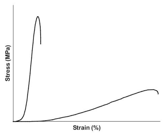 Diagrammatic representation of the stress-strain curves for different extracellular matrices containing collagen fibers. The curve on the left represents the behavior of tendon which contains collagen fibers that run almost parallel to the axis of the tendon. In contrast, skin exhibits a long low modulus region associated with stretching of the elastic fibers and a high modulus region associated with alignment of the collagen fibers with the loading direction.