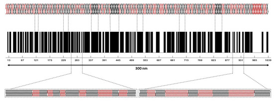Diagram of the flexible (red) and rigid regions (black) that make up the collagen molecule (top). The collagen triple helix is composed of three left-handed polypeptide chains that are wound around each other to form a right-handed triple helix depicted at the top. The black regions in the bar code below the triple helix (middle diagram) depict the rigid regions containing the amino acid residues, proline and hydroxyproline (black). The white areas represent the flexible regions that are poor in proline and hydroxyproline. Stretching of the triple helix first occurs in the white flexible regions.