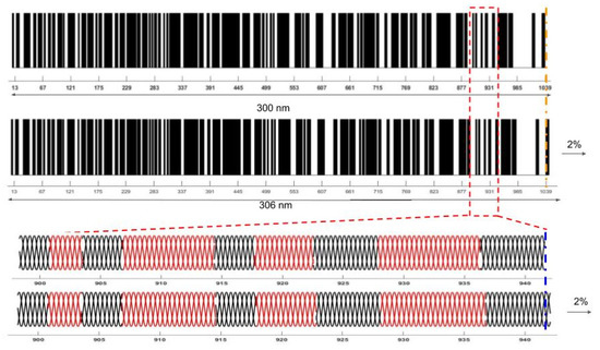 Diagram of energy storage in the collagen molecule via stretching of the flexible regions. When collagen triple helices are stretched, the flexible regions elongate and become more rigid by adopting a conformation more like the rigid regions. The diagram at the top shows the bar code depicting the collagen triple helix with rigid (black) and flexible (white) regions before and after stretching 2%. The diagram below the bar code shows that the red flexible regions deform axially while the black rigid regions are fixed during stretching. The stretching of the flexible regions lowers the entropy of the triple helix. Energy is stored by raising the free energy of the system during stretching while lowering the entropy. That energy is returned reversibly returned to the surrounding tissues when the load is removed from the collagen fibers.