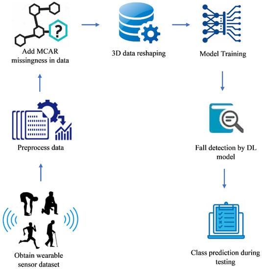 The aim of this research is to propose an accurate and precise fall detection mechanism while handling the disturbances caused by missing values observed in wearable sensor data. The adopted method relies on a DL approach, treating fall detection as a sequence classification problem in time series data. The proposed methodology is shown in Figure 1.