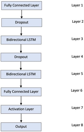 The overall proposed system design is shown in Figure 5. Two BiLSTM stacked on top of each other with additional dropout and fully connected layers are used. The dropout layers are only activated during the training phase and eliminated during the inference stage. 3D Data reshaping is done to make the dimensions of data in accordance with the LSTM parameter requirements. The three dimensions of input to each LSTM layer include samples, timesteps and features. The output dimensions are dependent upon the number of classes.