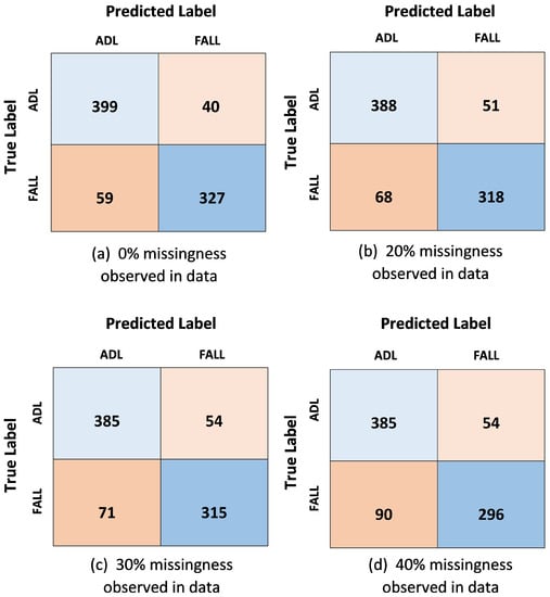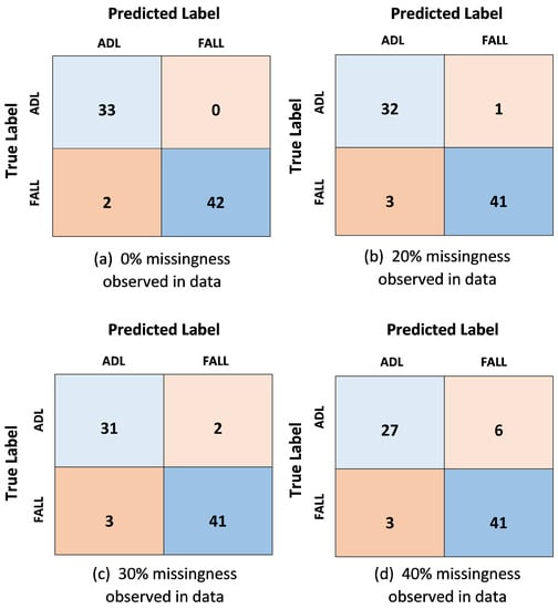 In case of single sensor approach using gyroscope applied on SisFall dataset, the results for class predictions show reduced performance in terms of accuracy and effectiveness analysis. Out of 33 ADL during testing, only 25 are correctly identified, the remaining are misinterpreted as FALL for the ideal scenario with no missing values. Similarly 12 out of 44 FALL cases are misclassified and predicted as ADL. The worst case scenario with 40% MCAR missingness added to the data results in 32 out of 44 incorrect predictions for the class FALL and only 12 true class predictions during testing. The findings from the confusion matrices lead to escalated error rates and bleak percentage outcomes for sensitivity, precision and specificity.