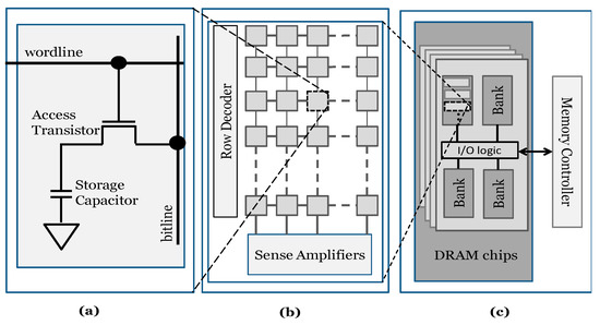 DRAM organization [12]. (a) DRAM cell. (b) DRAM subarray. (c) DRAM device.