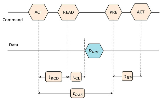 The hierarchy of a DRAM device organization is presented in Figure 1. As shown in Figure 1a, a DRAM cell is the lowest level of DRAM structure, which stores one bit of data based on the charge of its capacitor. A cell encodes value “1” when the capacitor is fully charged and value “0” as it is fully discharged. The cells are written to or read from using the access transistors, which are enabled by the wordline and the bitline connects the cells of each column. Figure 1b shows how these components form a two-dimensional subarray of a DRAM module. The combination of numerous subarrays forms a bank and banks are cooperated to organize a DRAM chip, as shown in Figure 1c. To activate a row, the row decoder enables the corresponding wordline, and then the stored information is transferred to the sense amplifiers. When the row is accessed, the data can be read/written using rd/wr commands [23]. Each read operation consists of multiple states, and the memory controller produces different commands and manages the states (see Figure 2). In the precharge state, all bitlines are precharged, and other open wordlines are deactivated after using the precharge (PRE) command. Before any rd/wr command can be generated, the corresponding wordline must be opened via the activation (ACT) command. Next, rd/wr commands can be sent to the opened row, subject to a minimum required time (activation time, tRCD). For a subsequent read/write operation, it is necessary to issue a PRE command to deactivate the opened row. The next row will be accessible after a specified time named precharge time (tRP). There are also other timing parameters such as tRAS and tCL that are used by the memory controller to manage DRAM operations [24,25,26,27].