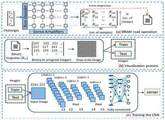 Figure 3 illustrates the entire enrollment procedure. It is made up of three steps: reading the DRAM PUF responses, converting them to gray-scale images and training the CNN.